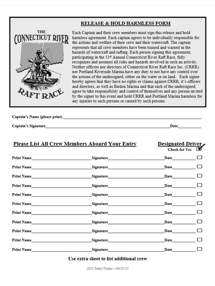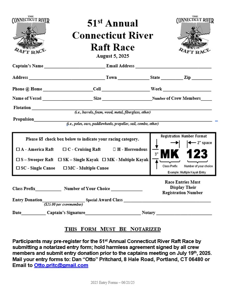Participants may pre-register for the 51st Annual Connecticut River Raft Race by submitting a notarized entry form; hold harmless agreement signed by all crew members, and submit entry donation prior to the Captains meeting on July 19, 2025. Mail your entry forms to: Dan Otto Pritchard, 8 Hale Road, Portland, CT 06480 or Email to Otto.pritc@gmail.com or call 860-883-5176.