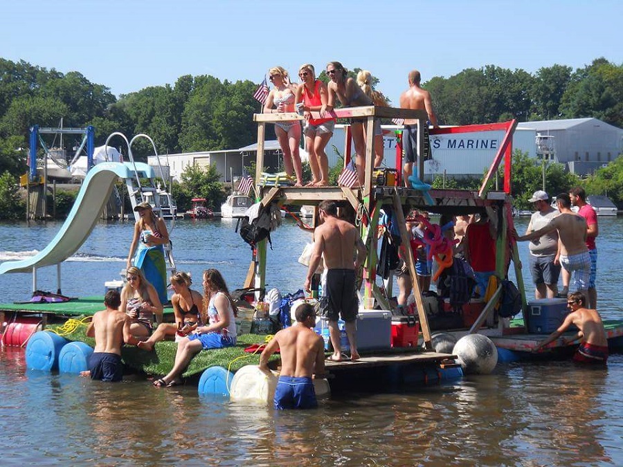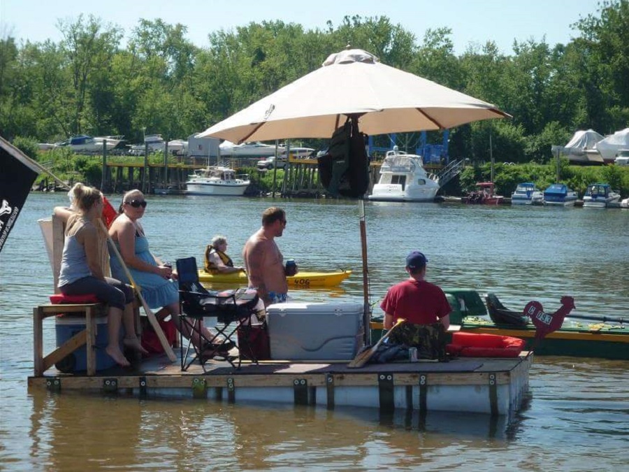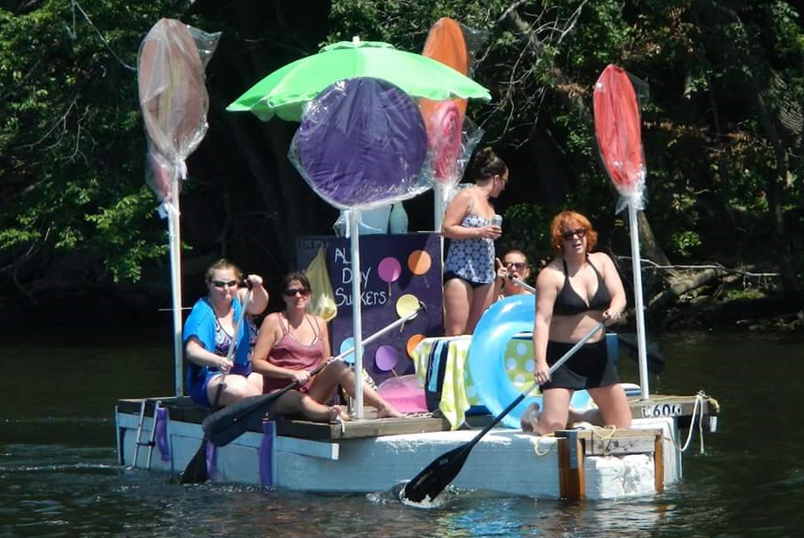 The All Day Suckers raft was built using dock foam and has a simple wooden frame that holds all the pieces together. This design is unsinkable since everything used in its construction is naturally buoyant. This is an easy raft to spot since it has four giant lollipops sticking up from the deck.