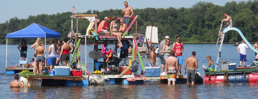 Barrels are a popular form of flotation used at the raft race. They can support a lot of weight, are very durable, and can be used as is with little if any preparation other than installing the bungs. Many of the rafts grow larger at subsequent events as more barrels are procured throughout the year.