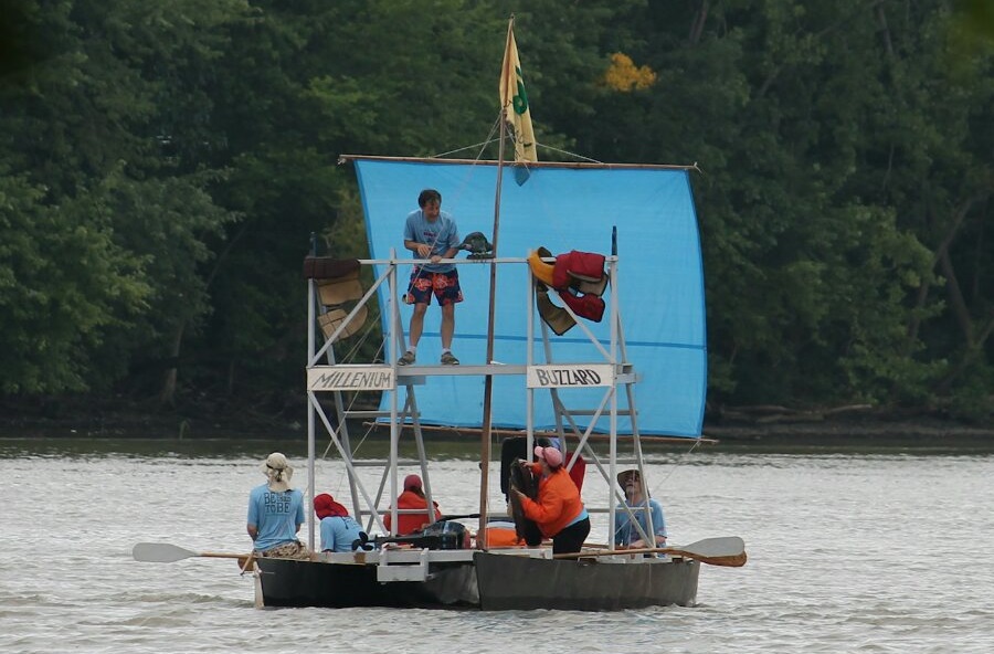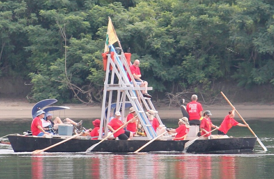 The Bucket Brigade raft was built by three girls who duct taped 5 gallon buckets to the rungs of an old ladder. They also attached foam to the sides too. An outrigger was added, for stability, at the suggestion of the raft inspectors upon which a plastic duck was attached. This simple barrel raft worked so well that the girls won the Becky Thatcher Award!
