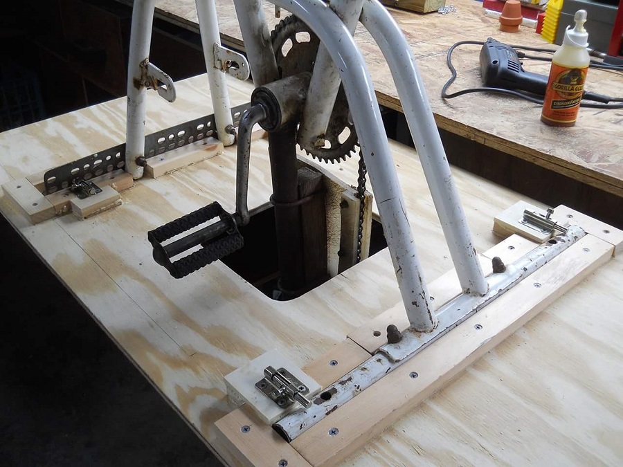 You will not need to oil the chain as water is a pretty good lubricant, plus you don’t want to be putting oil into the water. Cut a hole in the deck so the propeller unit can be put in the water but also allowing the frame to rest firmly on the deck. It's best to make a receiver that holds the bike frame in a stationary position. Multiple gate latches can be used to lock it in place.