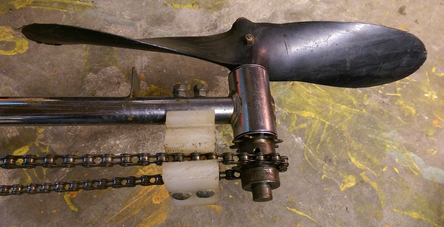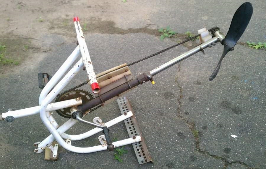 Another option is to build a pedal powered propeller. This can be a very efficient propulsion device. Building one will require more than just a few odds and ends from a bicycle. The easiest way to make one is to find an old stationary exercise bike and weld a pipe underneath the sprocket. This pipe needs to have a T-fitting on the opposite end where the a shaft, bearings, and propeller can be mounted.