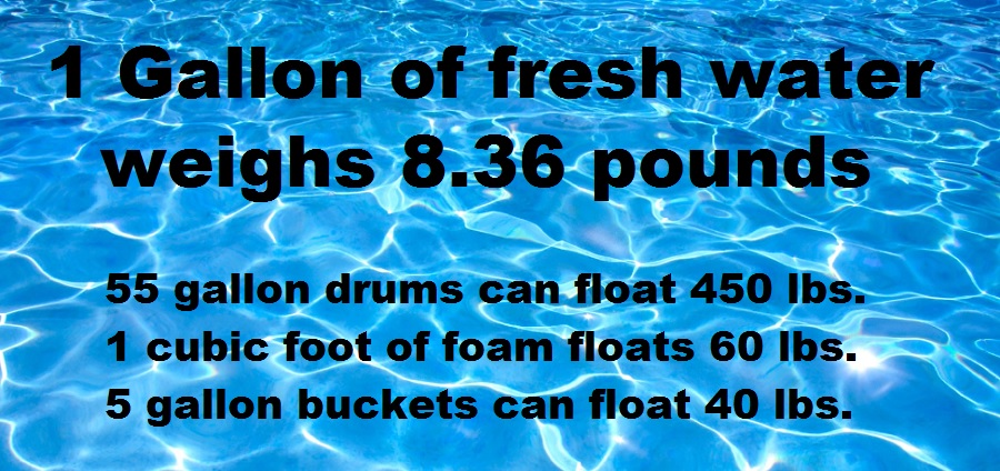 For each gallon of water displaced by flotation materials you will gain about 8 pounds of buoyancy. This is the force that causes objects to float. By dividing 1800 lbs. by 8 lbs. we calculate that 225 gallons of water needs to be displaced. This can be accomplished by using four 55 gallon drums, eight 30 gallon drums, 30 cubic feet of foam, forty-five 5 gallon buckets, or 225 one gallon milk jugs. Any combination of these materials can be used provided they equate to 225 gallons of displaced water.