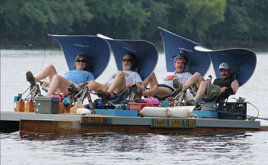 A few raft teams have build homemade paddle-wheels using an assortment of bicycle parts. These can work quite well if put together properly. Make sure you are able to adjust the height of the paddle-wheel assembly so that only the tips of the paddles hit the water. A paddlewheel submerged too deeply will be very hard to spin. The Lin Lee raft has a well designed paddle-wheel that works quite well. Four crew members push & pull on levers to propel the raft forward.